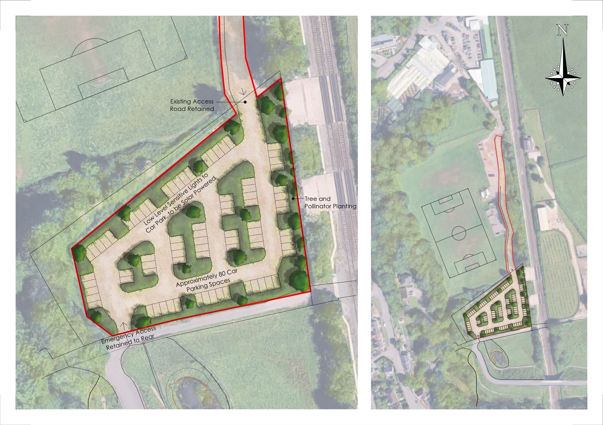- Tree planting and pollinator planting, including planting along the site edges and within the car park to soften and screen parked vehicles; and
